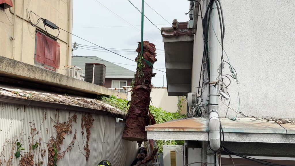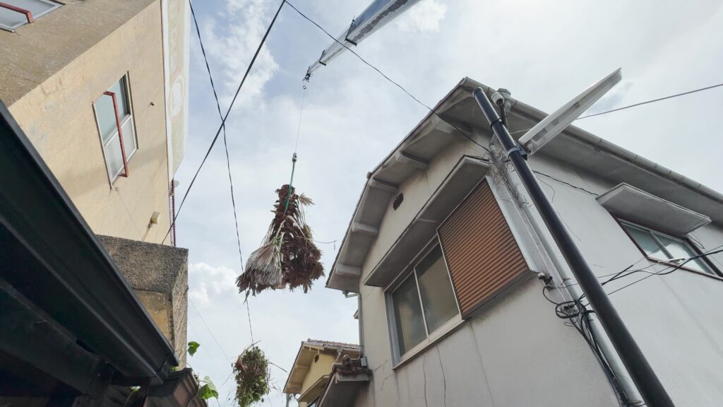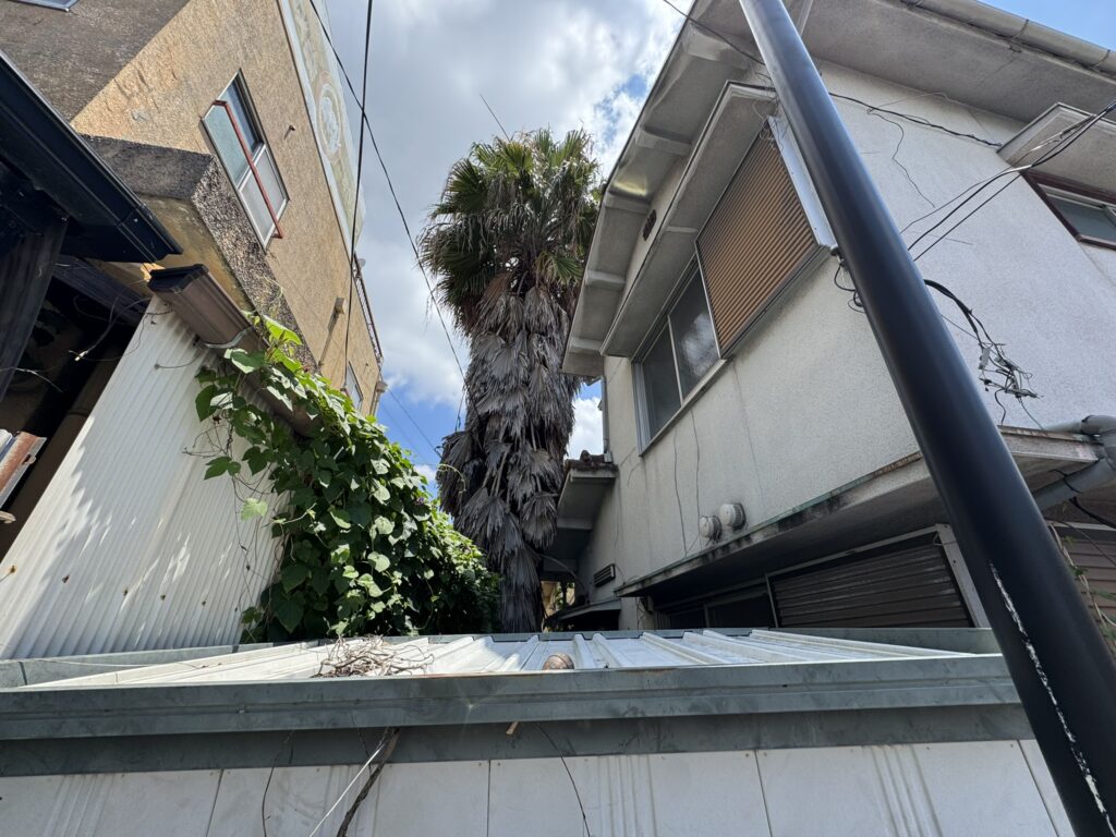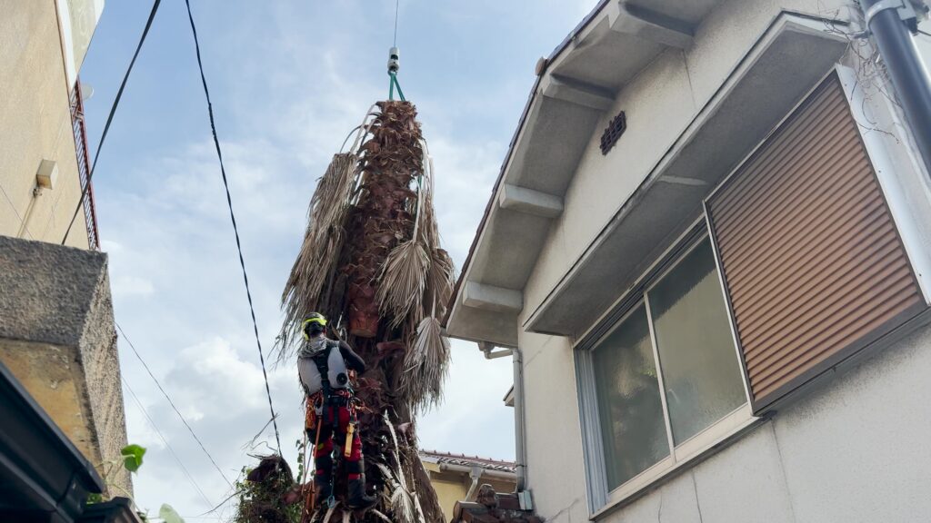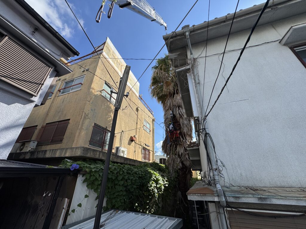 豊中市にて狭い隙間のヤシの木伐採を行いました。