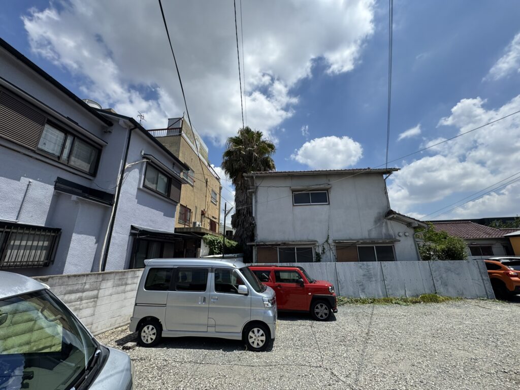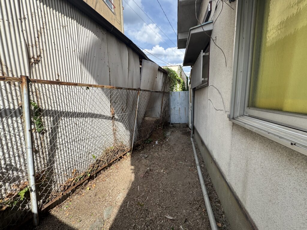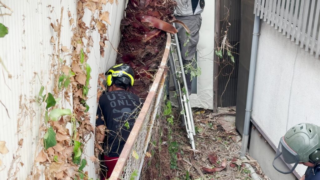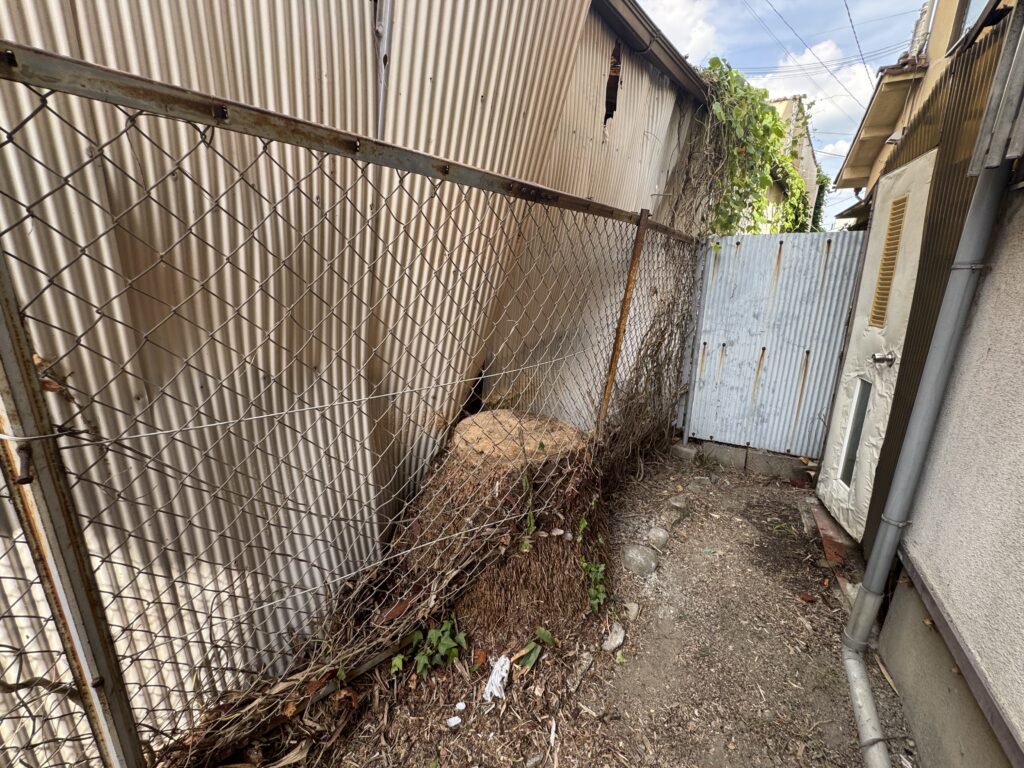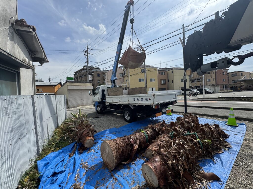 豊中市にて狭い隙間のヤシの木伐採を行いました。