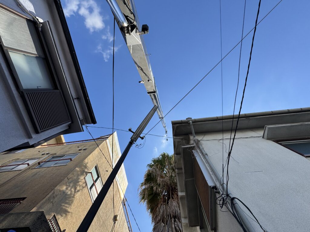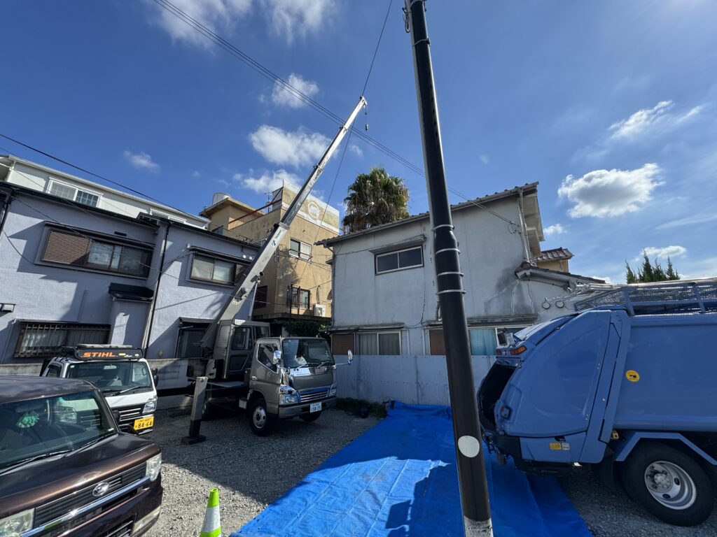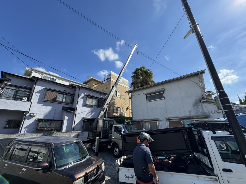 お隣の駐車場の一部をお借りしてクレーン車を設置し作業していきます。